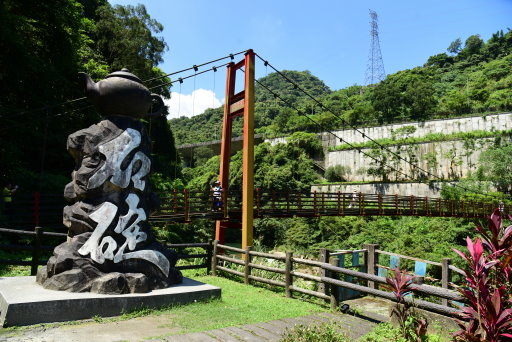 淡蘭吊橋前石碇石碑及茶壺,石碇以文山包種茶聞名。