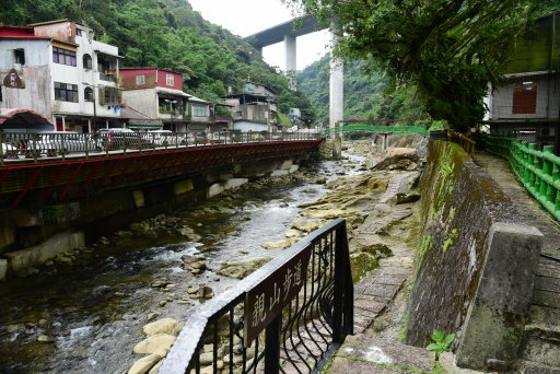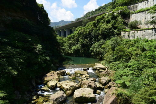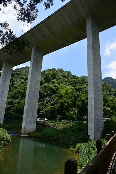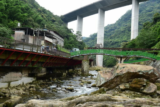 淡蘭吊橋橫越石碇溪,前方高架道路為國道5號(北宜高速公路)。