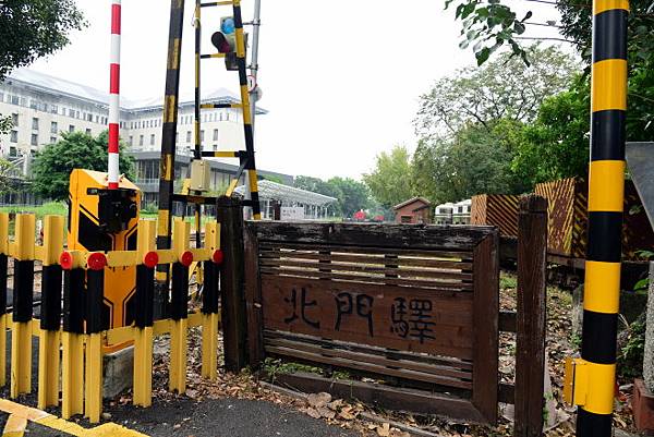 走至阿里山森林鐵路車庫園區出口到對面,即可看到北門驛字樣。往裡面眺望,就是北門車站。