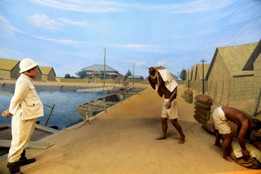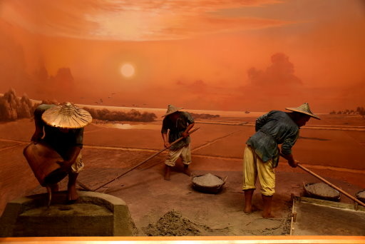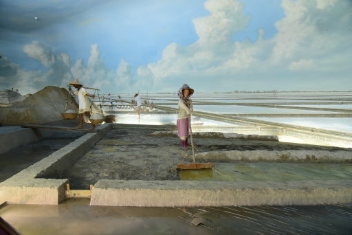 鹽田中栩栩如生的蠟像,呈現早期鹽工辛苦的工作情況。