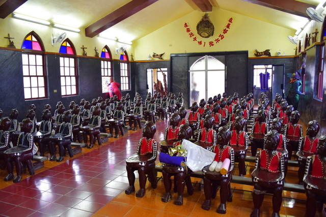 原來這些全是當地族人雕刻而成的人形座椅,白色袋子裡裝的是聖經,意涵裝滿了上帝的滿滿祝福。