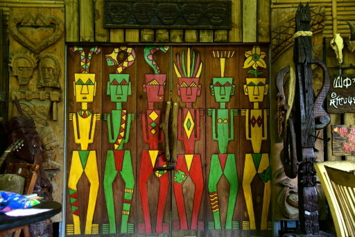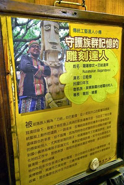 門上雕刻彩繪以魯凱族三原色:紅 黃 綠顯示。門後為刀疤工藝家作品展示館。