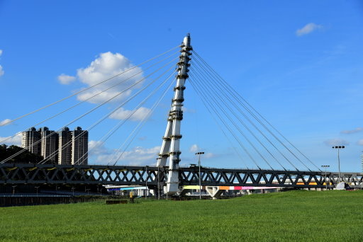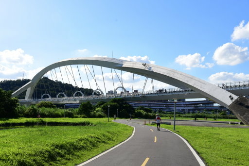 行經秀朗清溪河濱公園,橫跨新店溪的安坑輕軌安心橋白色橋塔,高達130公尺,非常吸睛!