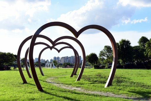 過福和橋來到古亭河濱公園婚紗廣場,逆光愛心拱門顏色有點暗淡。