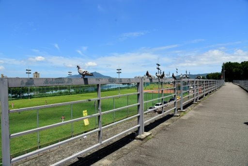 百齡右岸河濱公園正在打棒球的球員們,唯一的觀眾就是這些鴿兒們。