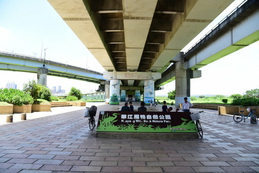 經過大稻埕碼頭來到華江橋下,難得今天華江雁鷝自然公園地標前沒人可以拍張照。