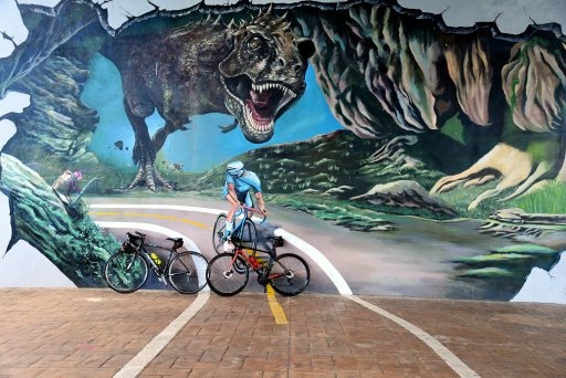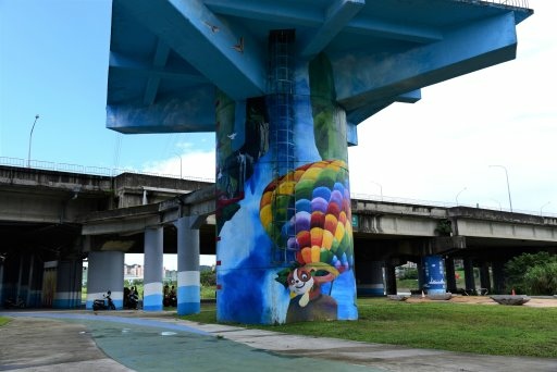 結果一路下雨,撐傘騎車來到華中橋下恐龍園區,恐龍彩繪真逼真!