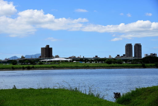 下跨堤人行陸橋,轉進淡水 河右岸自行車道,一路往上游騎。