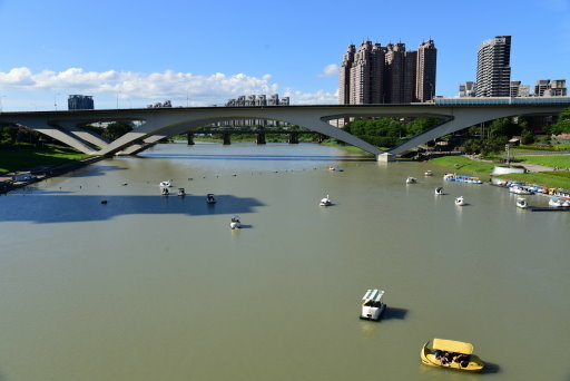 新店溪風光,圖左為台北市萬華區華江雁鴨自然公園,圖右為新北市板橋華江碼頭,跨河橋樑-前為萬板大橋,後為華翠大橋。