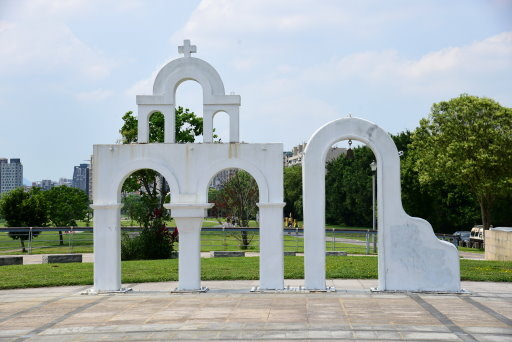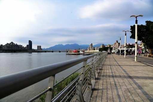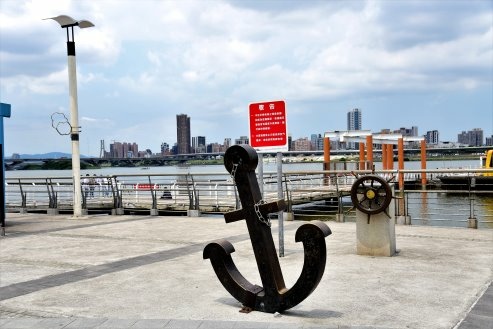 下跨堤人行陸橋,轉進淡水河右岸自行車道,一路騎到大稻埕碼頭。廣場上唐山帆船造景是拍照熱點。