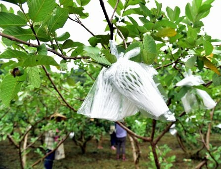 一顆番石榴套一層內袋,外面再用透明塑膠袋包好。