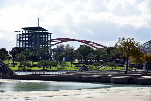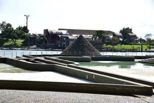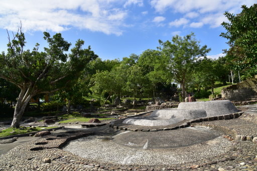 野外劇場,中間那圓錐形卵石丘有五座,由小而大依次排列,頂端連成一直線,貫通龜山島的頸部,是園區設計的主軸線。