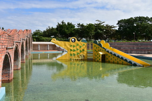 冬山河親水公園依利用方式分為三區:涉水區 泊船區 親子戲水區。非童玩節期間看不到水柱噴泉及戲水遊客。