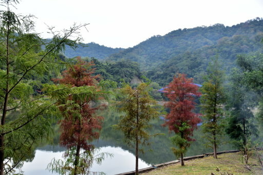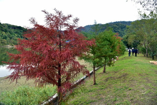 明湖蘇堤步道上有一整排落羽松,有幾棵已變紅。