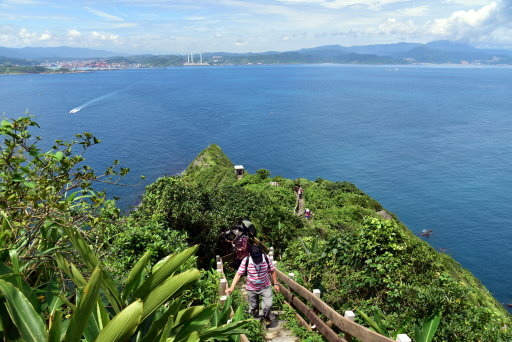 邊爬邊欣賞觀海棧道美景,海上較大島為小基隆嶼 。