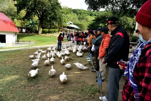 工作人員將飼料分一些給觀眾,大家可以餵鴨鴨。