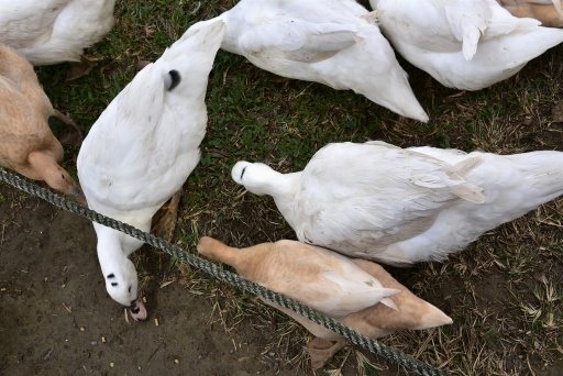 有些飼料掉出來了,鴨鴨將頭伸出繩子外來吃。