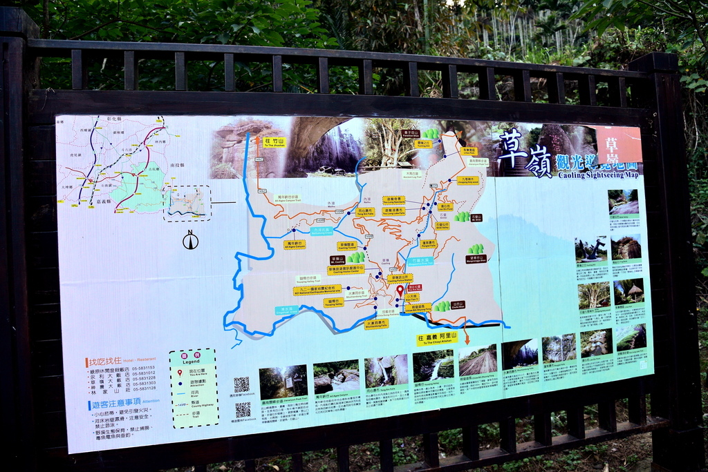 出入口處立有草嶺觀光導覽地圖。昔日草嶺十景是台灣很有名氣的觀光景點,現在有點式微了!