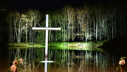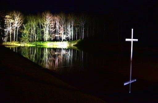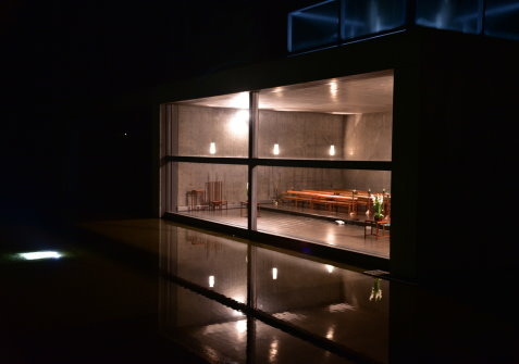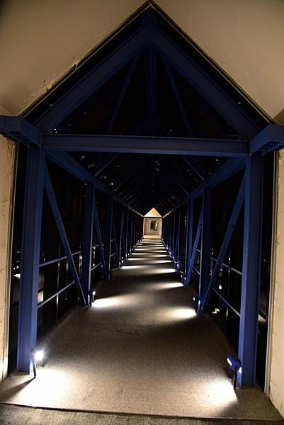 晚上8:30由水之教堂圍牆內走道拍攝教堂水池倒影,十字架也建立在水池中。