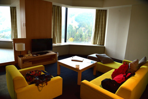 自窗邊往外看,中間高山就是TOMAMU山,左邊長廊是通往各個餐廳的室內連接通道。