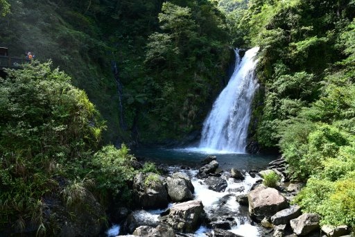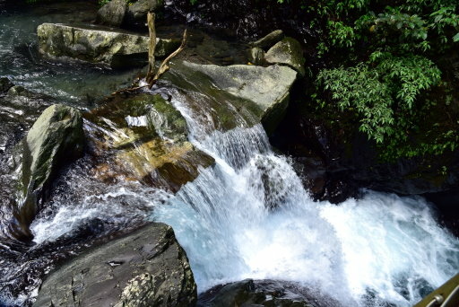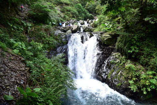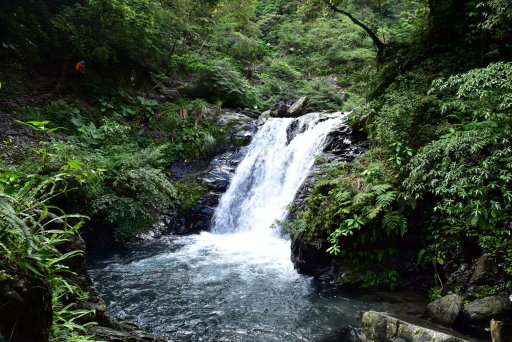 第一層瀑布,溪水自高處直洩而下,氣勢磅礡,底下沖激出深潭。