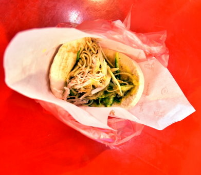 於是買了一個雞絲炒麵刈包,內饀有炒麵 雞絲 洋蔥及小黃瓜,灑上馬告(山胡椒)。