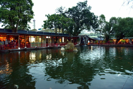 環繞水池的商店街後方還可看到花蓮糖廠大煙囪