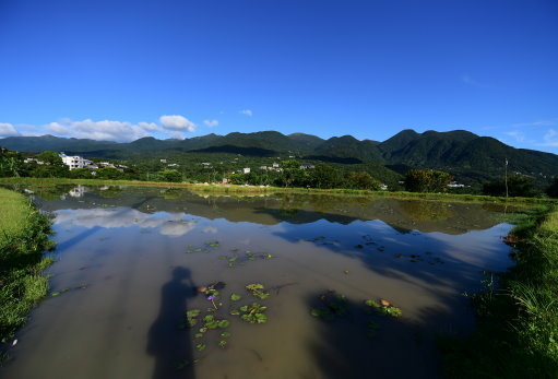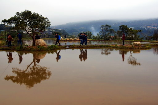 沒有藍天白雲,遊客倒影成了水田美麗景致。