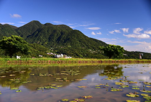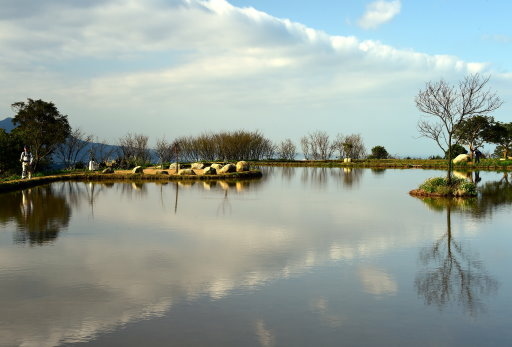 三芝秘境-水中央,位於新北市三芝北8鄉道(奎柔山路)4.5K處。三塊相連的水田,本來是種植蓮花,因入冬及福壽螺的關係,居民將蓮花清走,沒想到竟然爆紅,成為三芝新秘境。