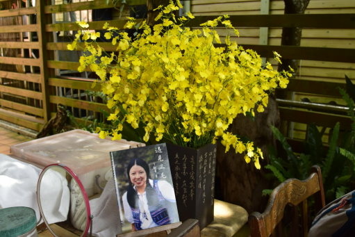 桌上照片為三毛,「遇見三毛」是丁松青神父的著作。