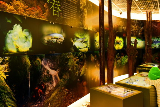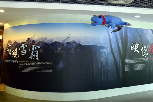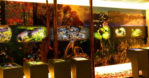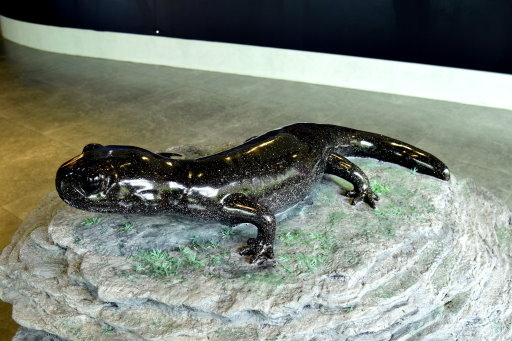 一進入展示室,天花板上吊著一隻山椒魚布偶。