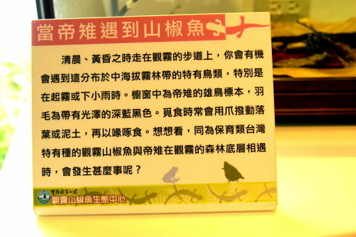 生態中心結合雲霧步道,將觀霧山椒魚的型態、生活史、分布狀況、面臨的危機以及國家公園進行棲地復育工作現況完整呈現,提供民眾瞭解觀霧山椒魚生態以及感受全球氣候變遷影響的環境教育場所。