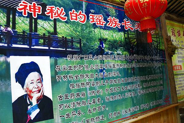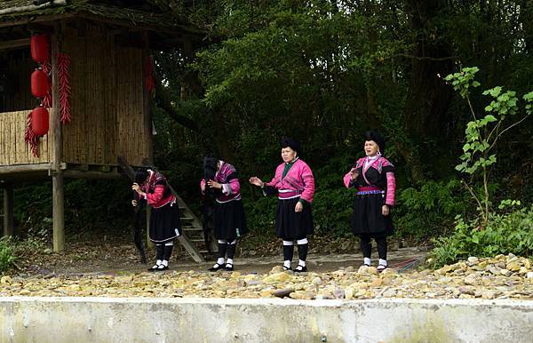 岸邊紅瑤族婦女表演長髮秀(紅瑤族婦女喜歡穿紅色上衣而得名)