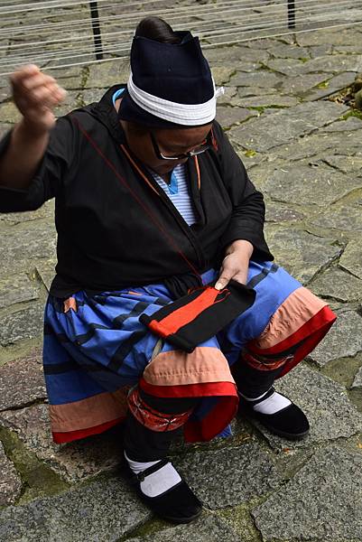 這位婦女正在縫製布腳環,就是套在小腿上有花樣的紅色布條