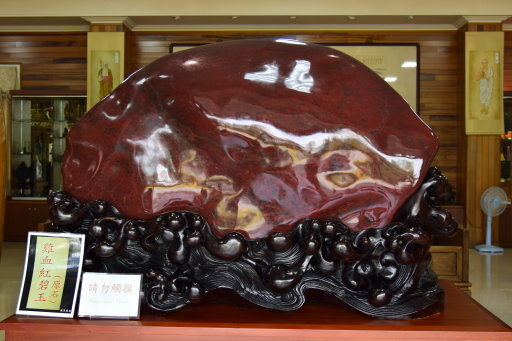 雞血石館內入口處這顆價值連城的雞血紅碧玉,是原石喔!