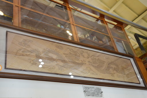 藺草文化館內,地上兩幅畫作是近年稻田彩繪圖樣。