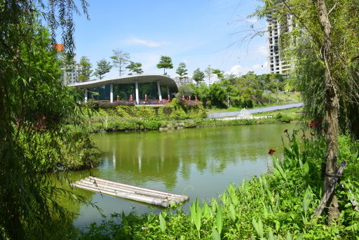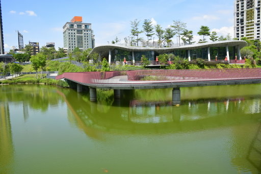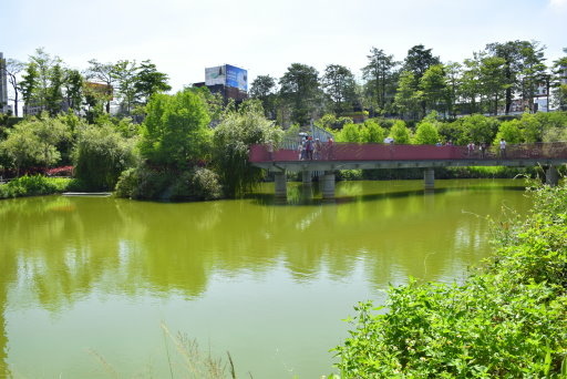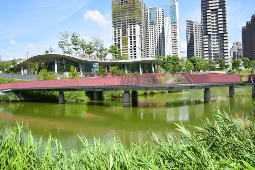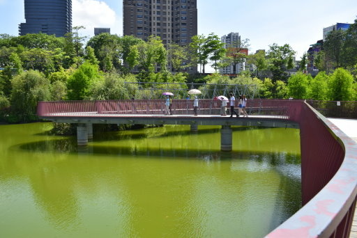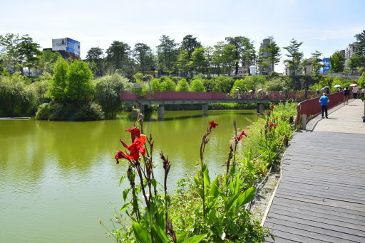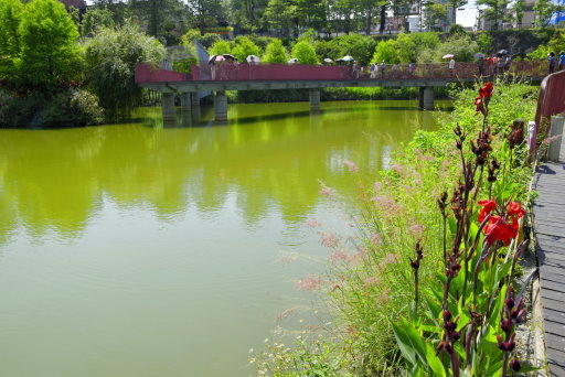 在一片綠意中,紅色九曲橋蜿蜒湖上。