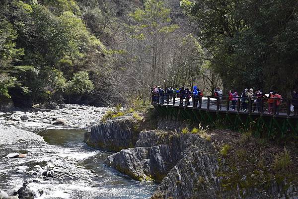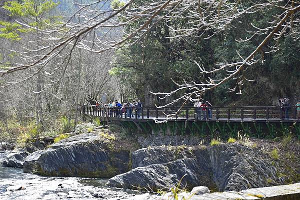 七家灣溪是台灣國寶魚櫻花鉤吻鮭的家,遊客在觀魚台上駐足觀賞,有人興奮的說看到了櫻花鉤吻鮭了。