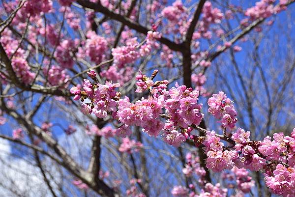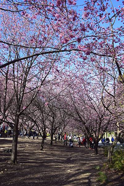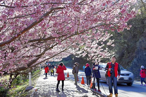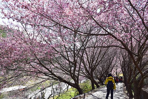 紅粉佳人櫻花像粉紅巨龍般迎接遊客,官網說今天紅粉佳人櫻花開約七成。