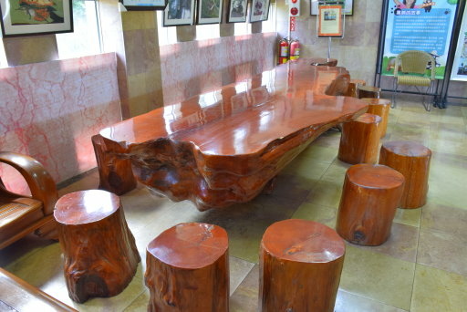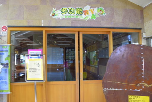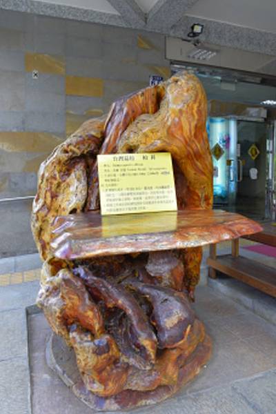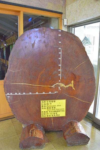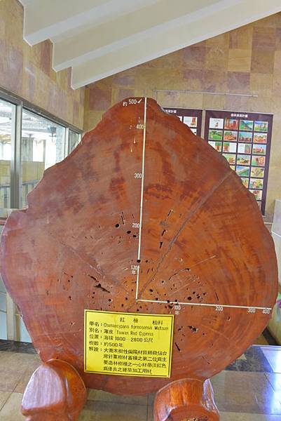 多媒體視廳室前展示一片紅檜木頭,樹齡約500年。