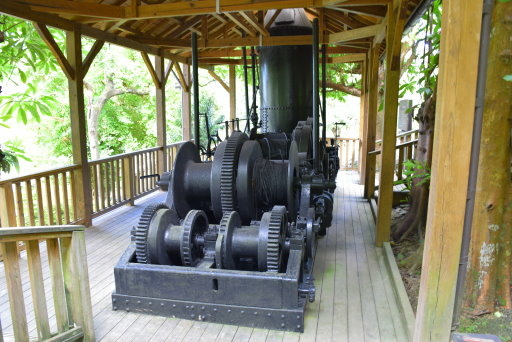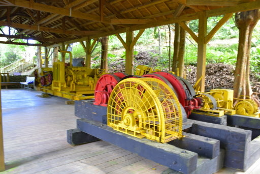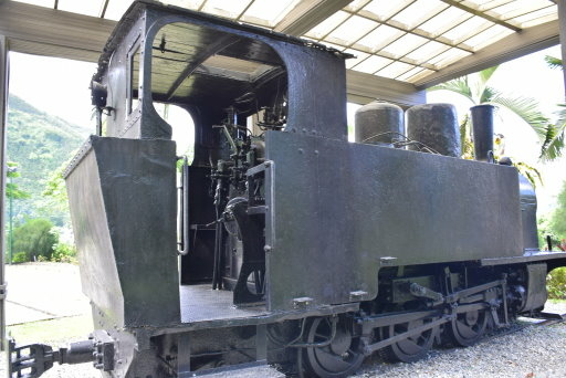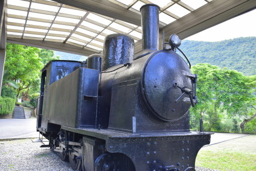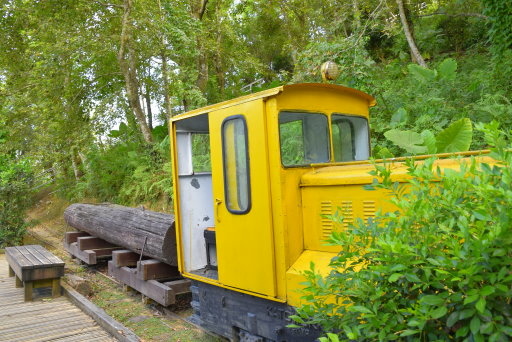 林間步道旁陳列著各式保存良好的退休運材機具。上圖為平地運材蒸汽機關車。