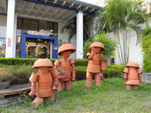 廣場前有許多販賣當地農特產的商家及餐廳.這家石農咖啡店前以大小花盆堆疊,設計出一家四口造型,感覺超吸睛的!