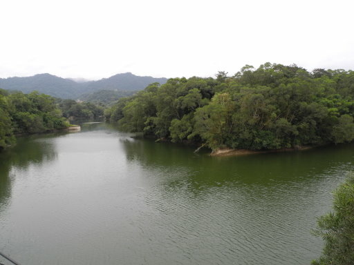 站在吊橋上眺望明湖水漾及海棠島廟宇