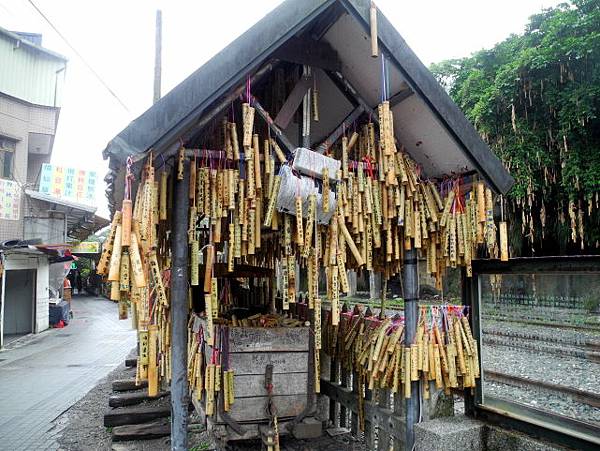 涼亭上掛滿了大大小小的遊客祈福竹筒,就連樹上也是.