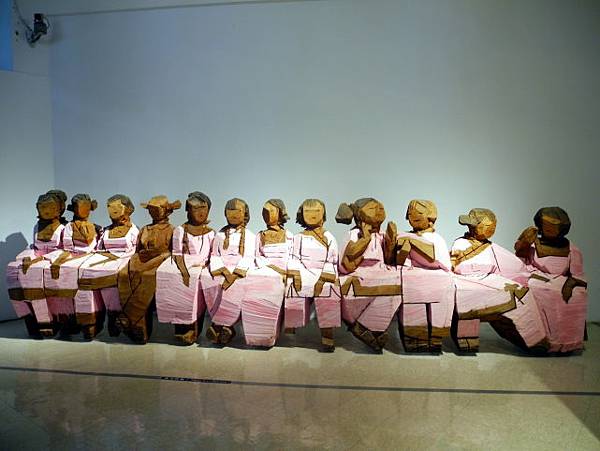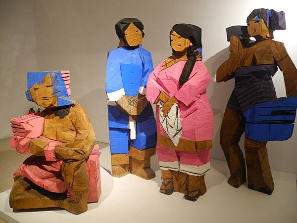 解說員問大家為什麼作品中那位少女的顏色和其他人不一樣,大家各自說出自己的想法.但朱銘大師的答案只有一個,而你們的答案又是什麼呢?