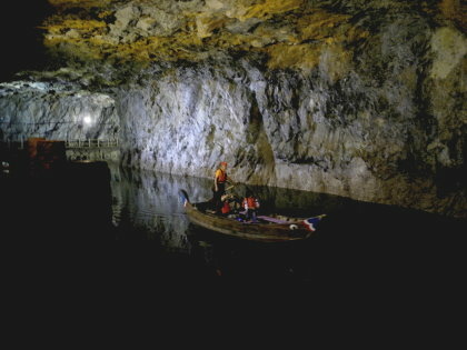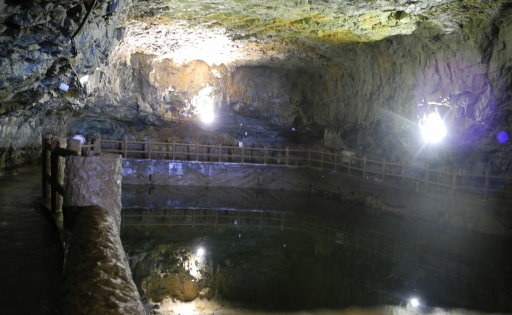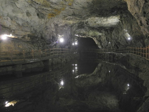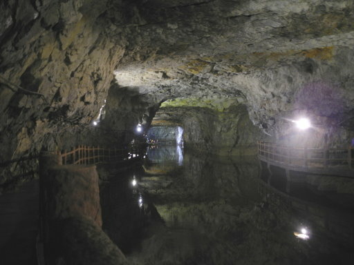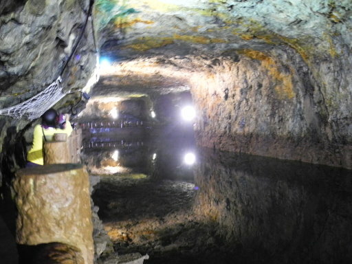 在陰暗的坑道內只見美麗的水中倒影,完全看不出水深.