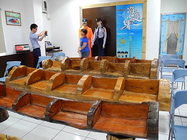 海巡文化簡報室內的椅子是海巡團隊內有專長的好手們利用漂流木自製而成的,參觀民眾於此觀賞文宣短片。