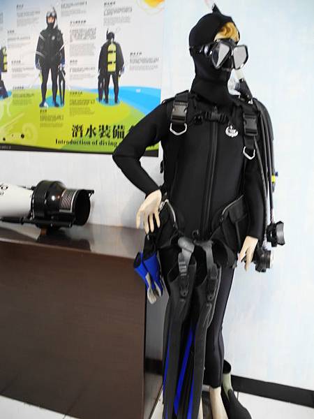 救生救難展示館內,展示各項潛水裝備及救生器具。