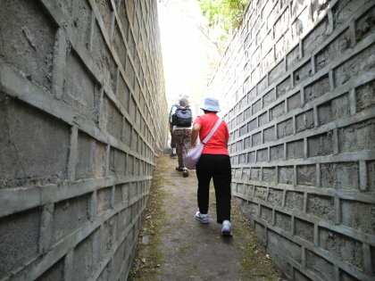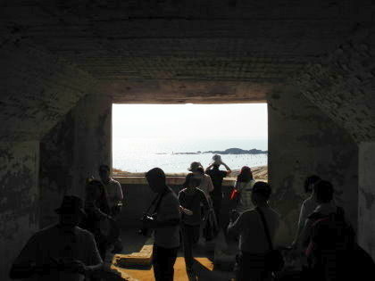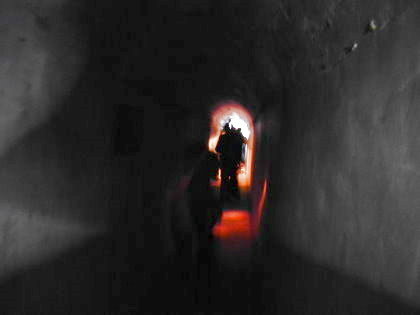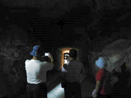坑道內彎曲狹窄,且無照明設備,5人一組由帶路人拿著手電筒,來到轉彎處時後面整個漆黑一片,走起來有點可怕.聽阿兵哥說以前他們勤務時也是要拿手電筒進來的.
