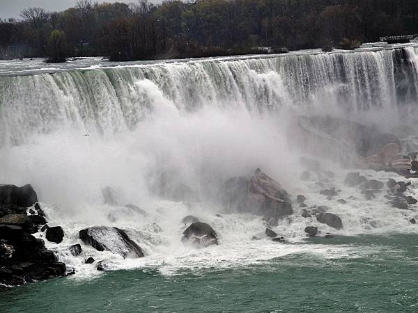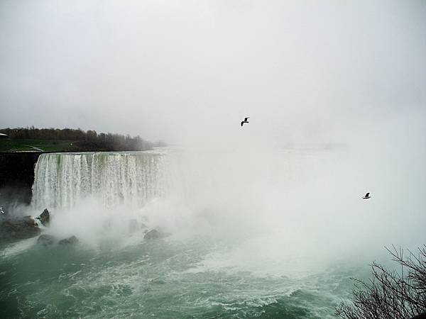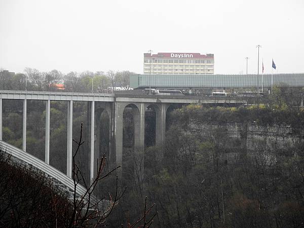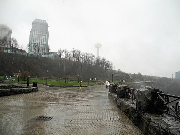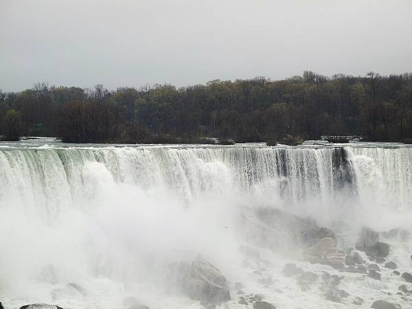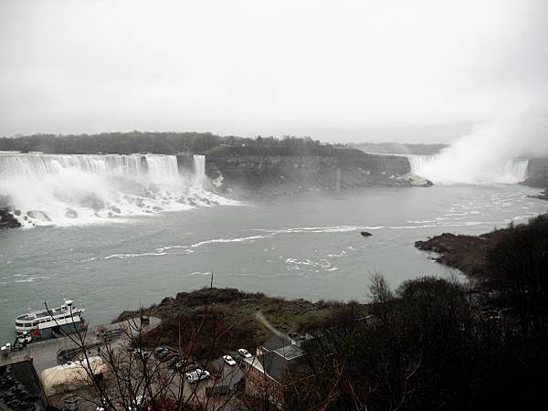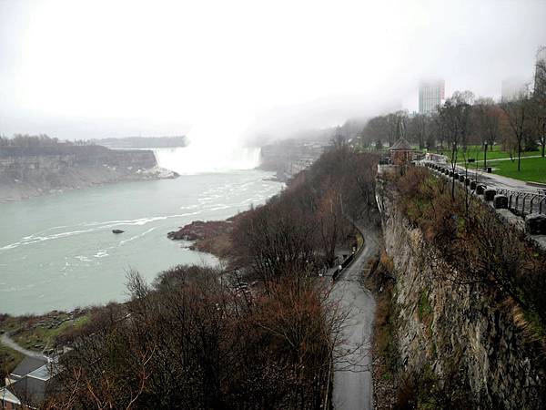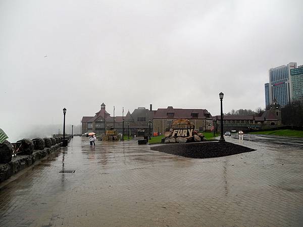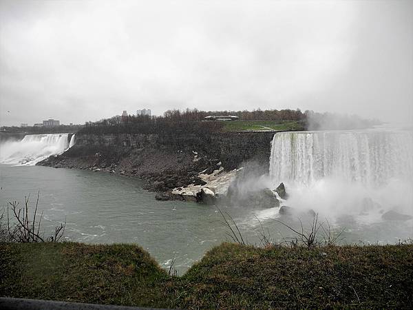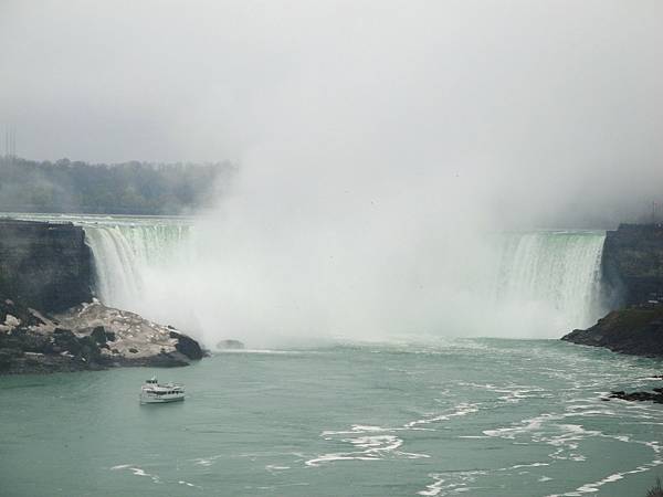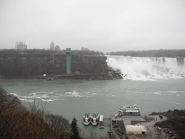 前方建築物為美國紐約洲水牛城,水面上為霧中少女號遊船,可惜現在還未開航,無法感受航行於瀑布之下的刺激感。